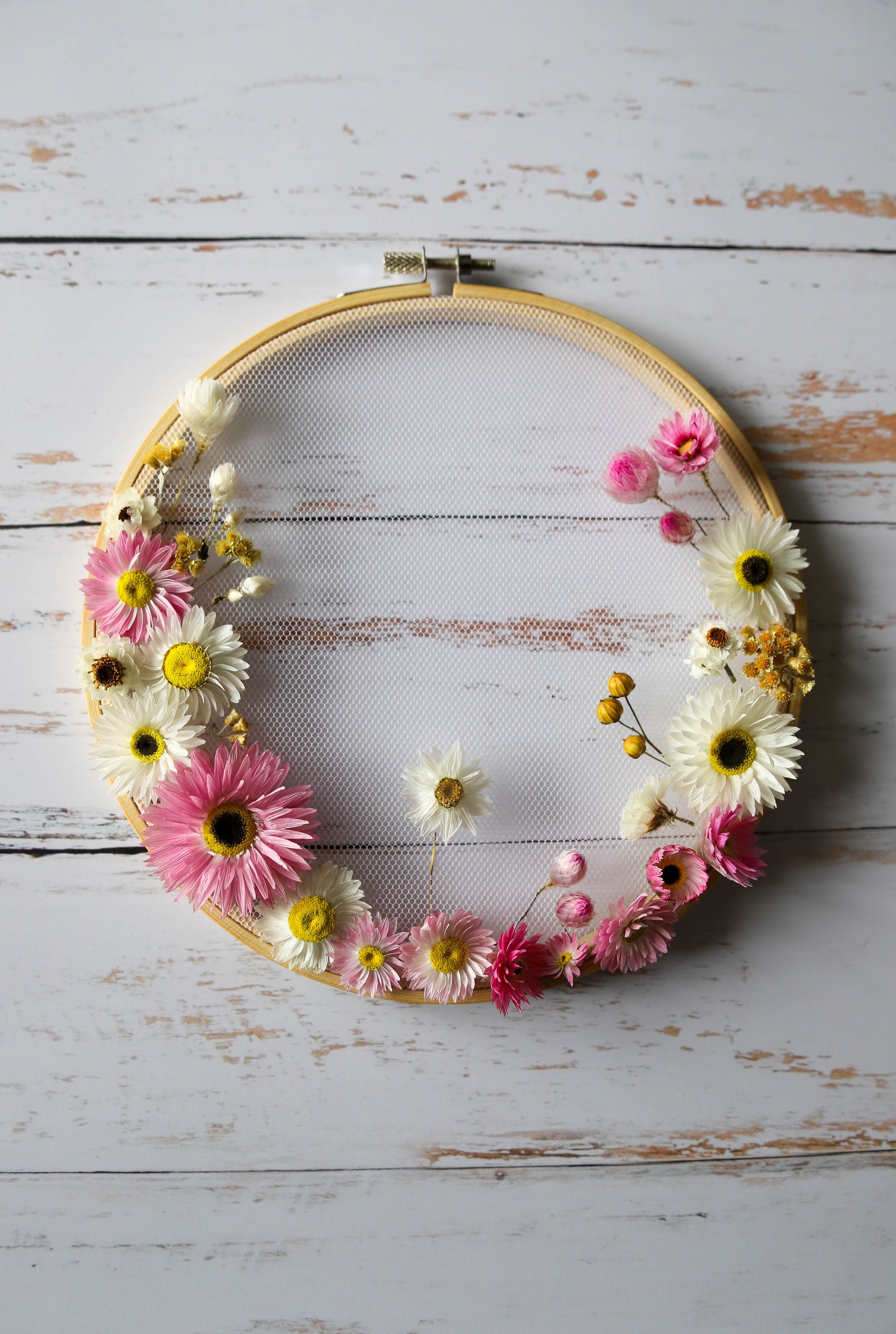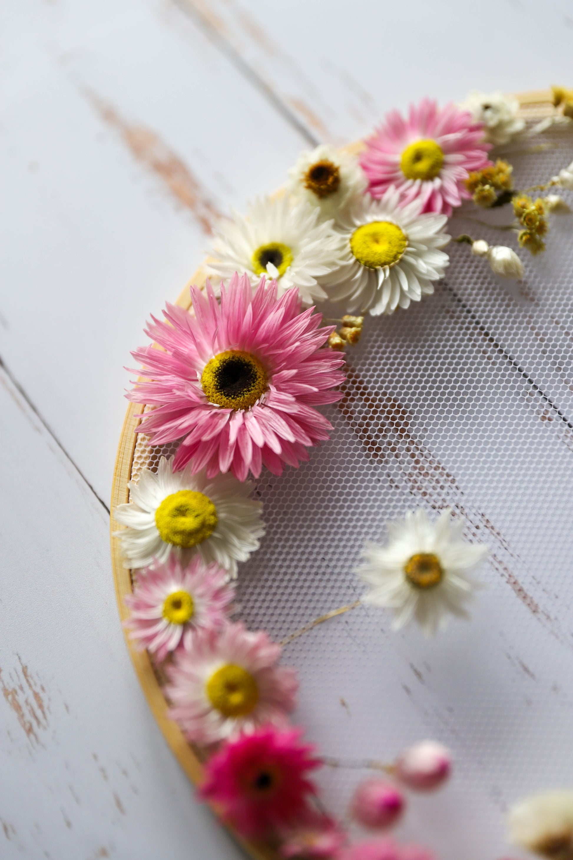J’ai soigneusement cueilli et fait sécher chaque fleur. Ce sont des acroclinium, helicrysum italicum et lin.