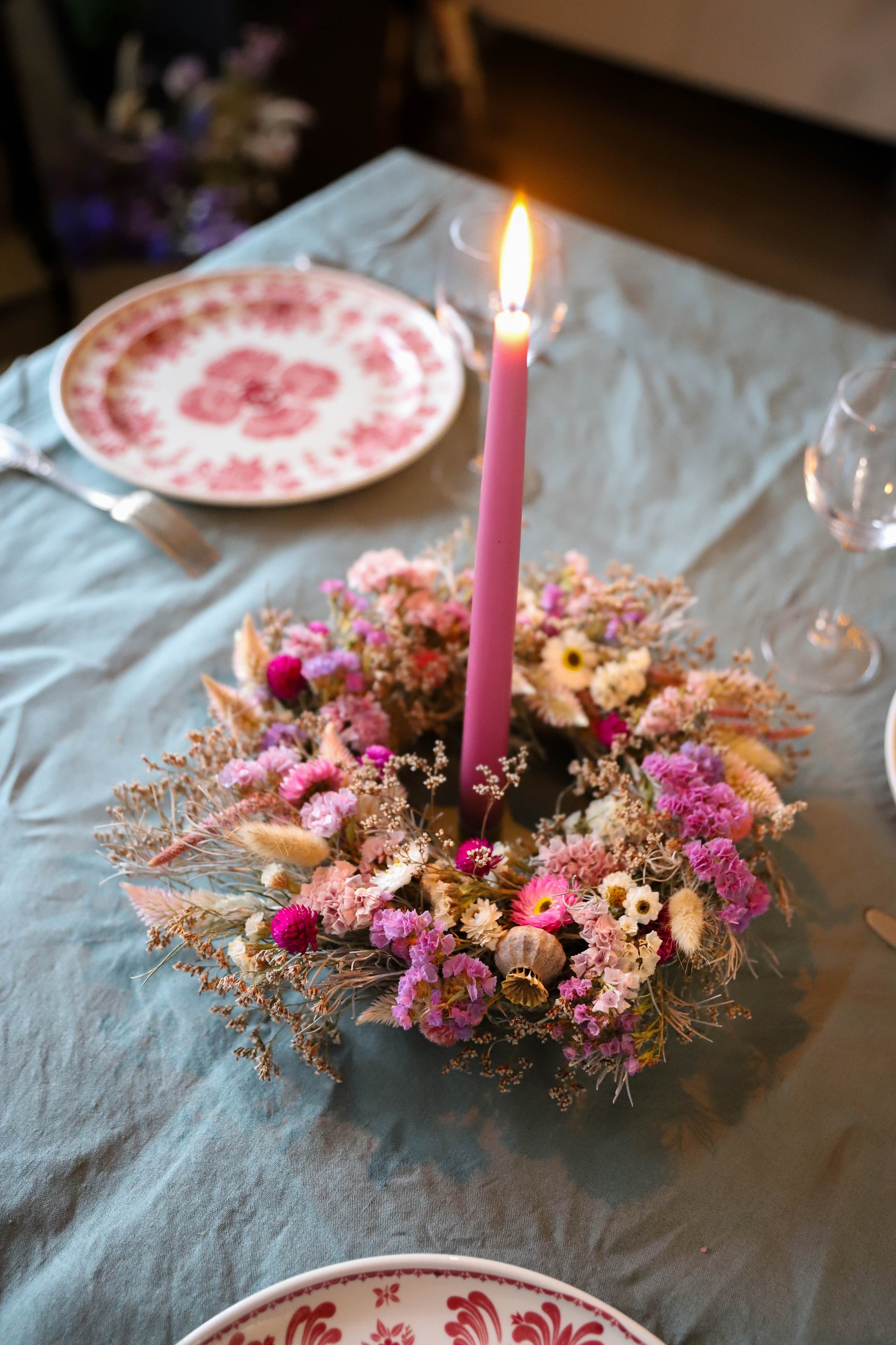 Les fleurs sont fixées avec de la ficelle. J'ai choisi différentes variétés dans les couleurs roses. Il est possible de demander une couronne dans d'autres coloris.