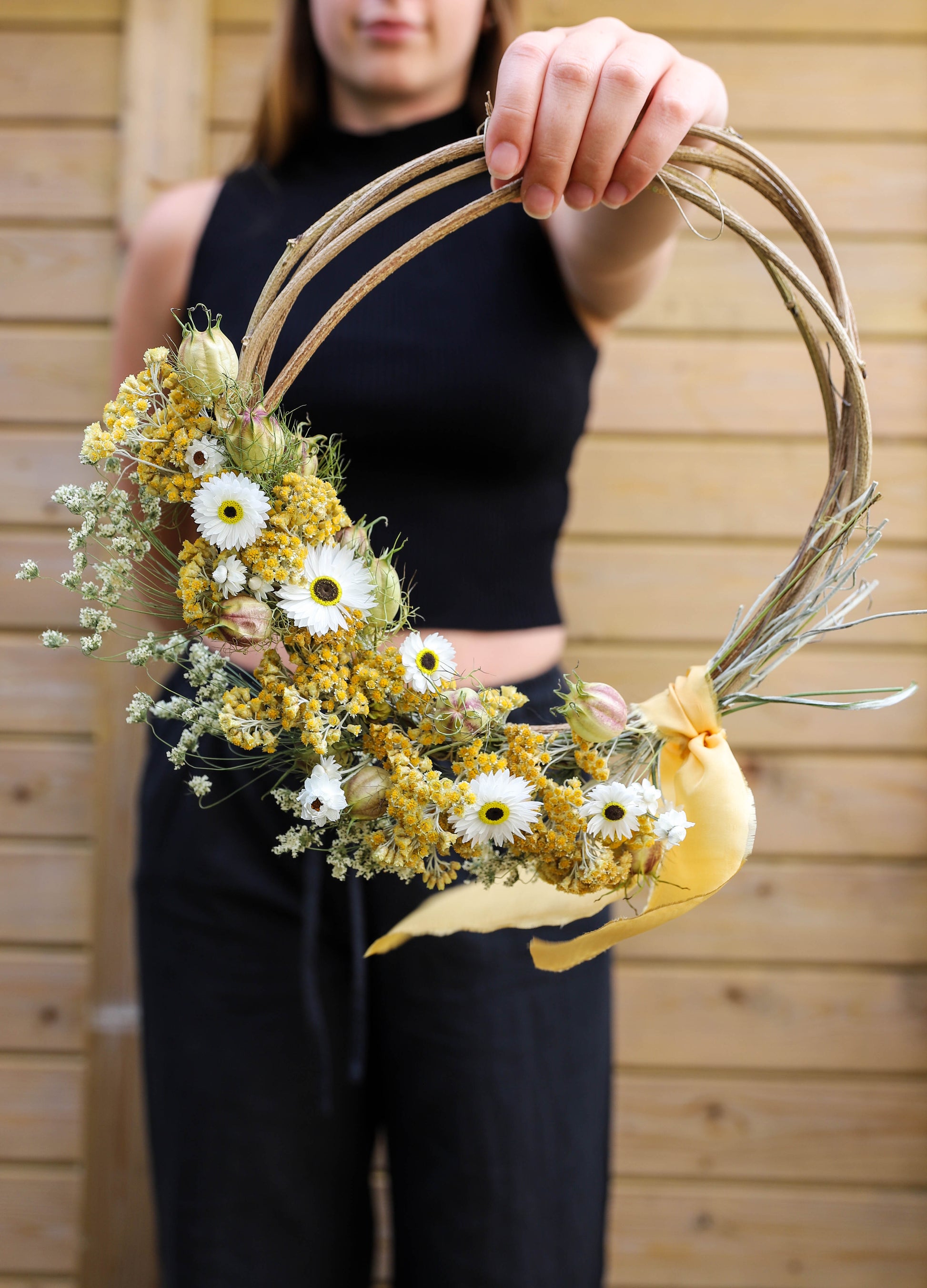 Cette couronne a été réalisée avec des végétaux cultivés sans traitement chimique sur mon terrain situé dans les Hauts-de-France, aux portes de la Baie de Somme.