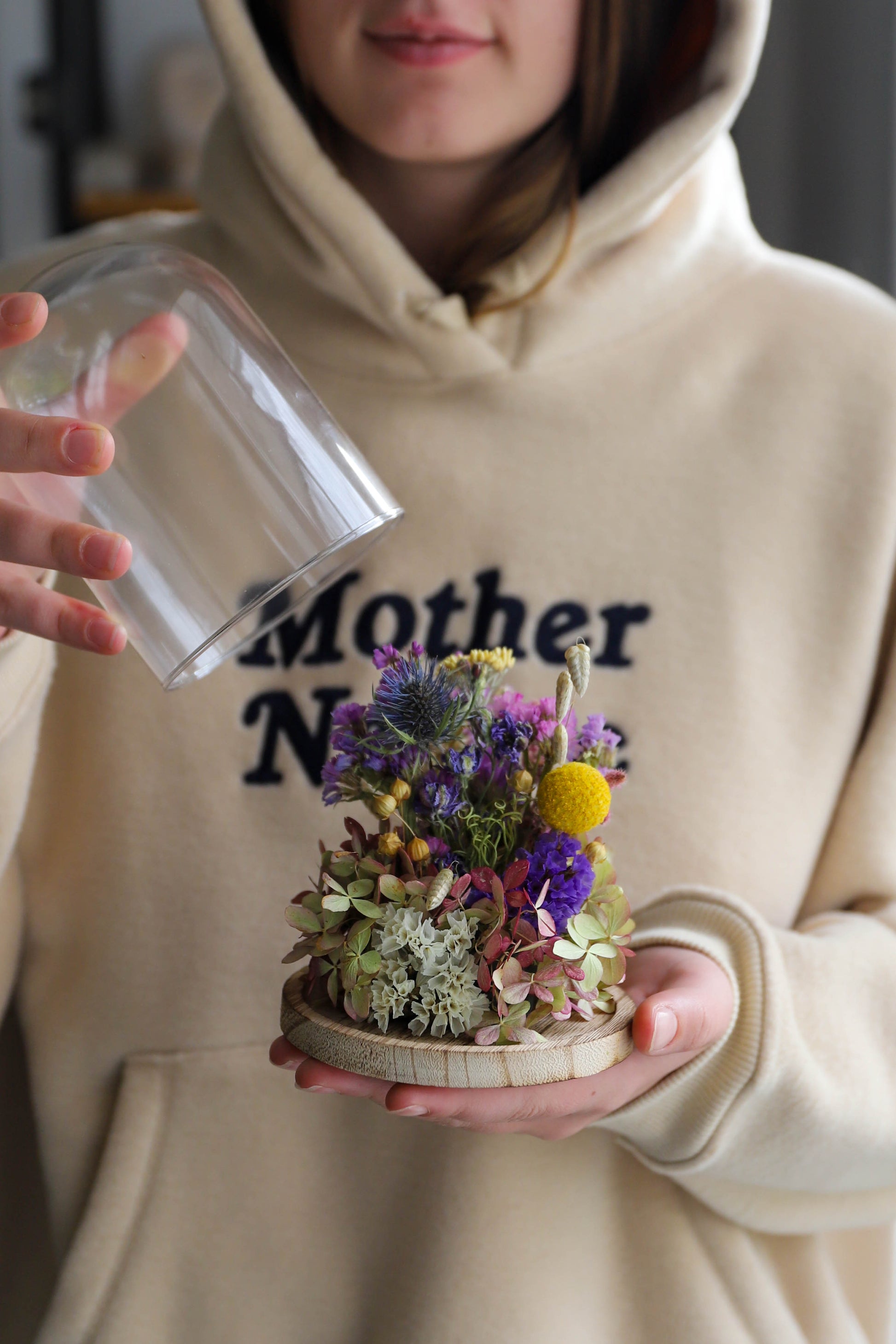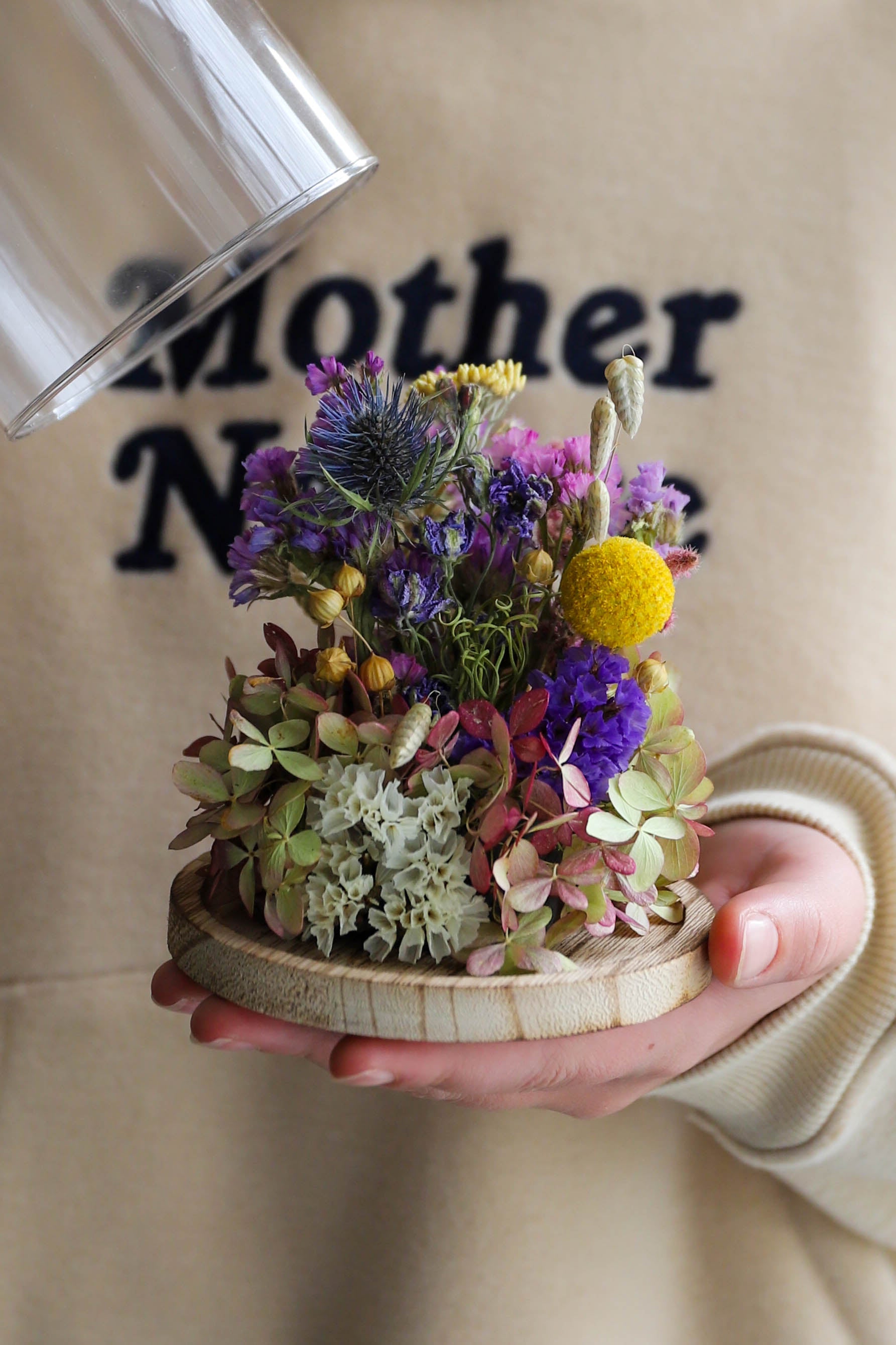 Dimensions de la cloche en verre, diamètre 10.5cm x Hauteur 13.5cm. Le socle est en bois.